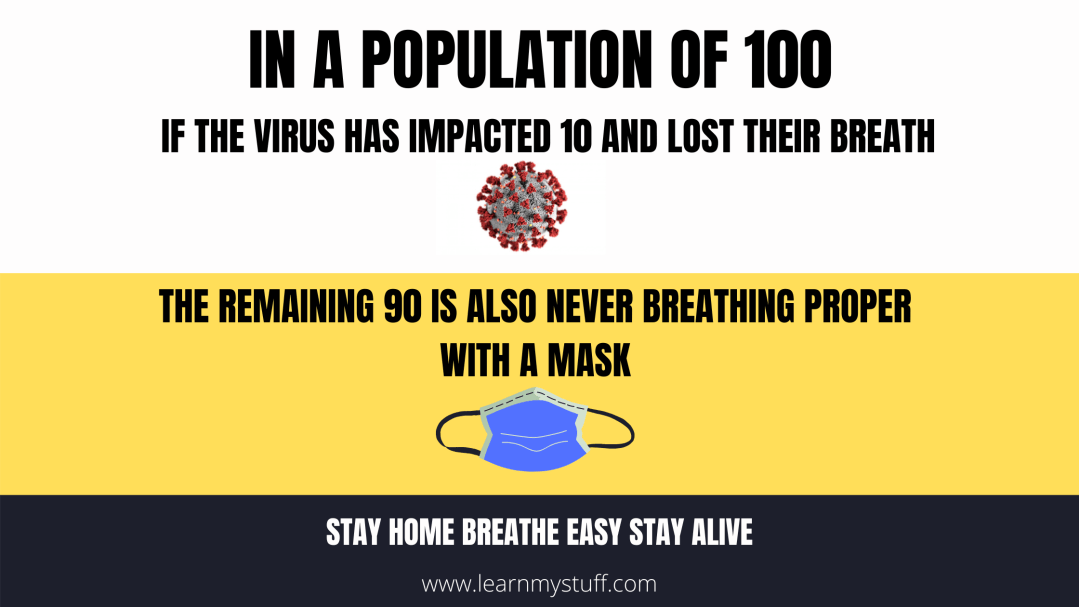 If the VIRUS pandemic has impacted the lungs of many and lost their life’s, the rest of us are also destroying the lungs our self’s by not allowing to get proper oxygen supply due to a mask and the most scariest part is we are in taking more carbon dioxide at a faster rate. What i mean by that is we are inhaling back the same air which we have exhaled out at at faster rate. Wearing a Mask may prevent the spread of the virus to others but the possibility of killing oneself with lack of proper oxygen supply is also a bigger threat at the same time.